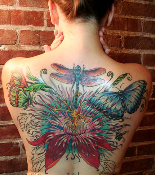 Dragonfly tattoos are very rangy in both style and size, as we see a few of excellent designs above, one being a large back piece and another much smaller ankle pic.